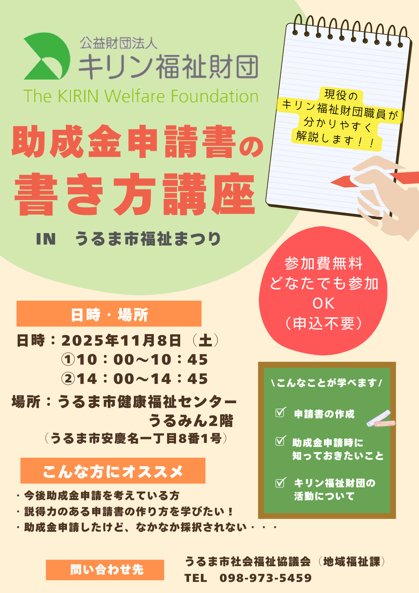 この講座では、現役の公益財団法人キリン福祉財団職員が講師となり、助成金申請時に知っておきたいこと、申請書作成の仕方など助成金申請の極意とキリン福祉財団の活動について、丁寧に解説します!