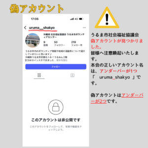 Instagramにおいて、うるま市社会福祉協議会の偽アカウントが見つかりました。